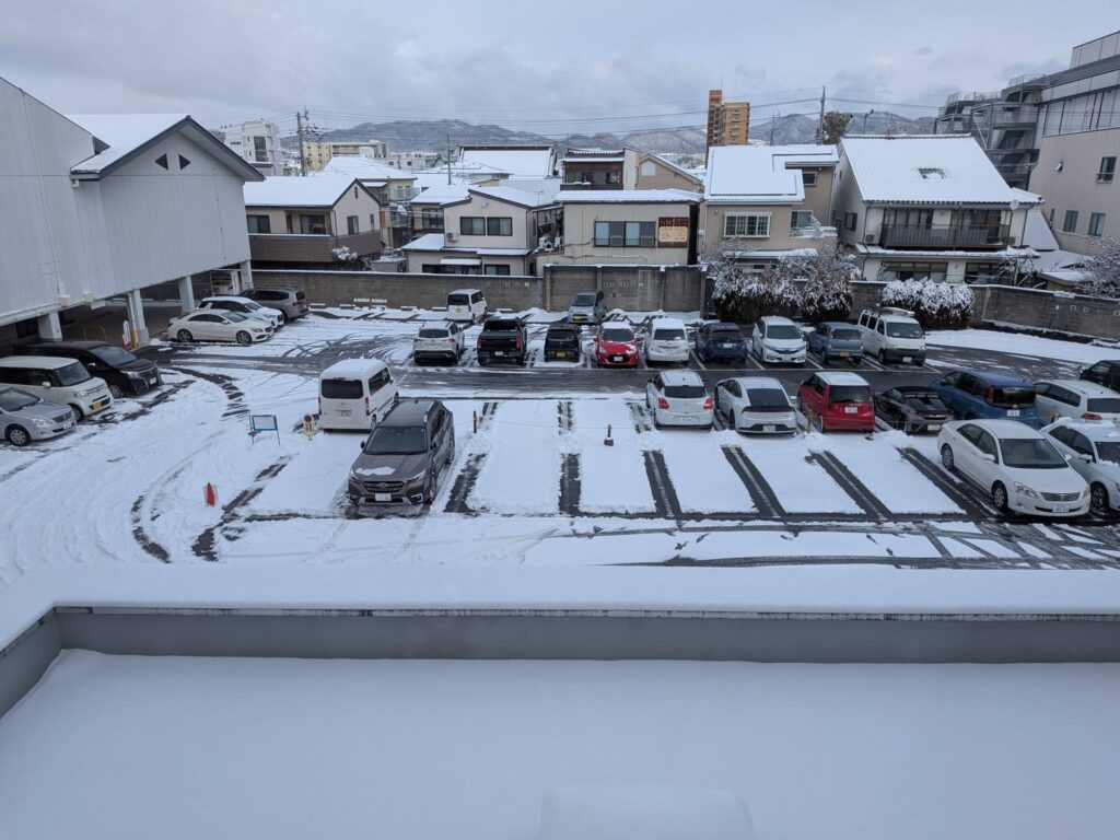 修練前には早く来た拳士が、駐車場の雪かきを手伝っていました。